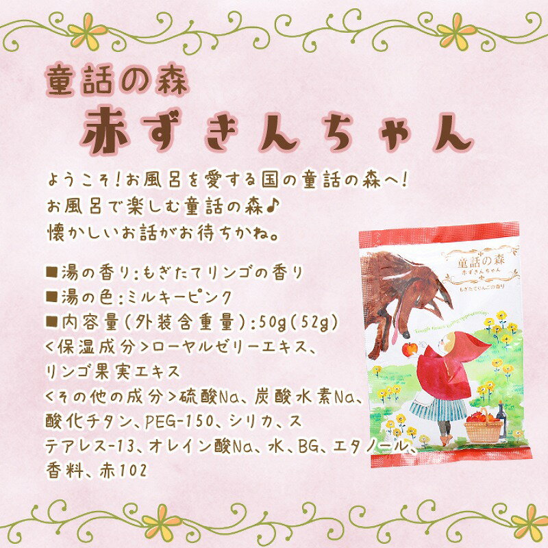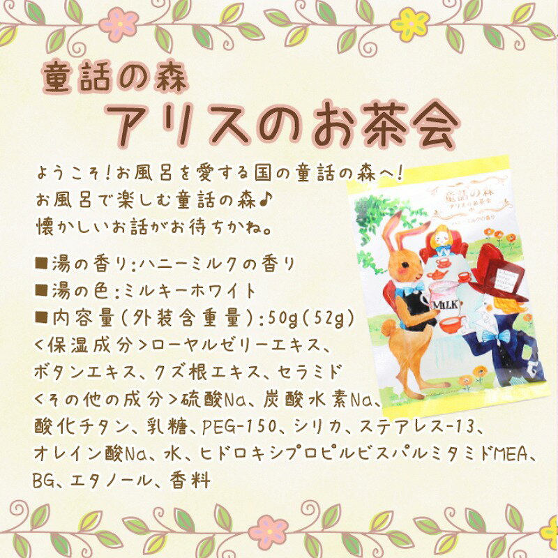 ●赤ずきんちゃんお湯の香:もぎたてリンゴの香りお湯の色:ミルキーピンク<保湿成分>ローヤルゼリーエキス、リンゴ果実エキス<その他の成分>硫酸Na、炭酸水素Na、酸化チタン、PEG-150、シリカ、ステアレス-13、オレイン酸Na、水、BG、エタノール、香料、赤102●ヘンゼルとグレーテルのお菓子の家お湯の香:はちみつの香りお湯の色:ミルキーイエロー<保湿成分>カニナバラ果実エキス、ローヤルゼリーエキス、ヒアルロン酸 <その他の成分>硫酸Na、炭酸水素Na、酸化チタン、PEG-150、シリカ、ステアレス-13、オレイン酸Na、水、BG、エタノール、香料、黄4、黄203●アリスのお茶会お湯の香:ハニーミルクの香り お湯の色:ミルキーホワイト<保湿成分>ローヤルゼリーエキス、ボタンエキス、クズ根エキス、セラミド<その他の成分>硫酸Na、炭酸水素Na、酸化チタン、乳糖、PEG-150、シリカ、ステアレス-13、オレイン酸Na、水、ヒドロキシプロピルビスパルミタミドMEA、BG、エタノール、香料ご注文時に「追跡可能メール便」をお選び頂く事で「ゆうパケット送料無料」の対象となります。