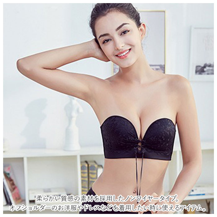 ブラジャー ストラップレス 通販 ワイヤーなし ボリュームアップ 肩ひもなし 肩紐なし ブラ ストラップレス ブラ紐なし レース フロントリボン 脇高 極厚 育乳 内蔵パッド おしゃれ ドレス