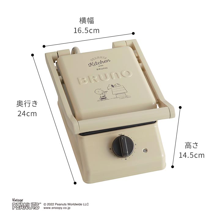 Detail 詳細 商品名 BRUNO ブルーノ スヌーピー PEANUTS グリルサンドメーカー シングル BOE091 サイズ 約 W 16.5 x H 14.5 x D 24 cm コード長:約 1.3m 重量 約 2kg(ホットサンドプレート使用時) 材質 本体:フェノール樹脂、スチール、アルミニウム合金 プレート:アルミニウム合金(内面ふっ素樹脂塗膜加工) 電源 AC100V 定格消費電力 550W 機能 タイマー付き、プレート取りはずし可 保証 お買い上げ後1年間 BRUNO(ブルーノ)シリーズは こちら キッチン総合 ランキング